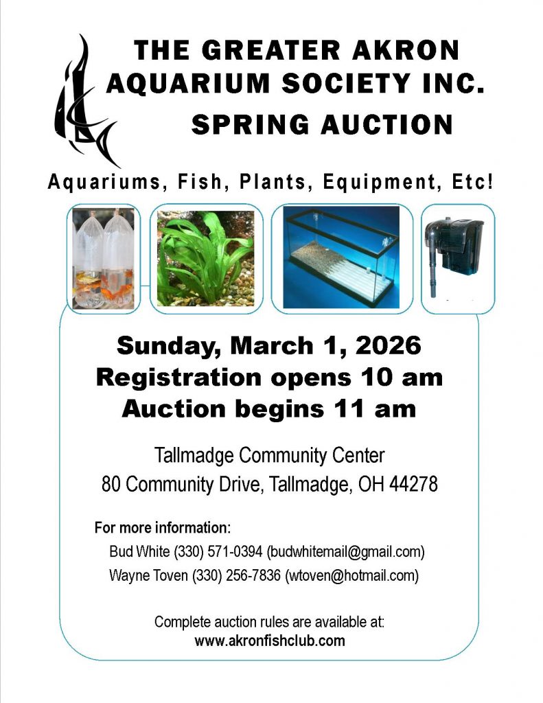 The meeting starts at 8 pm and is held at the Ritchie Memorial Shelter House, 109 West Avenue, Tallmadge, Ohio. We will have refreshments, a mini-auction that includes 2026 BAP/HAP submissions, and a product raffle. The Bowl Show classes for January will be Goldfish, Male Guppies; Minnows, Danios, and Rasboras.