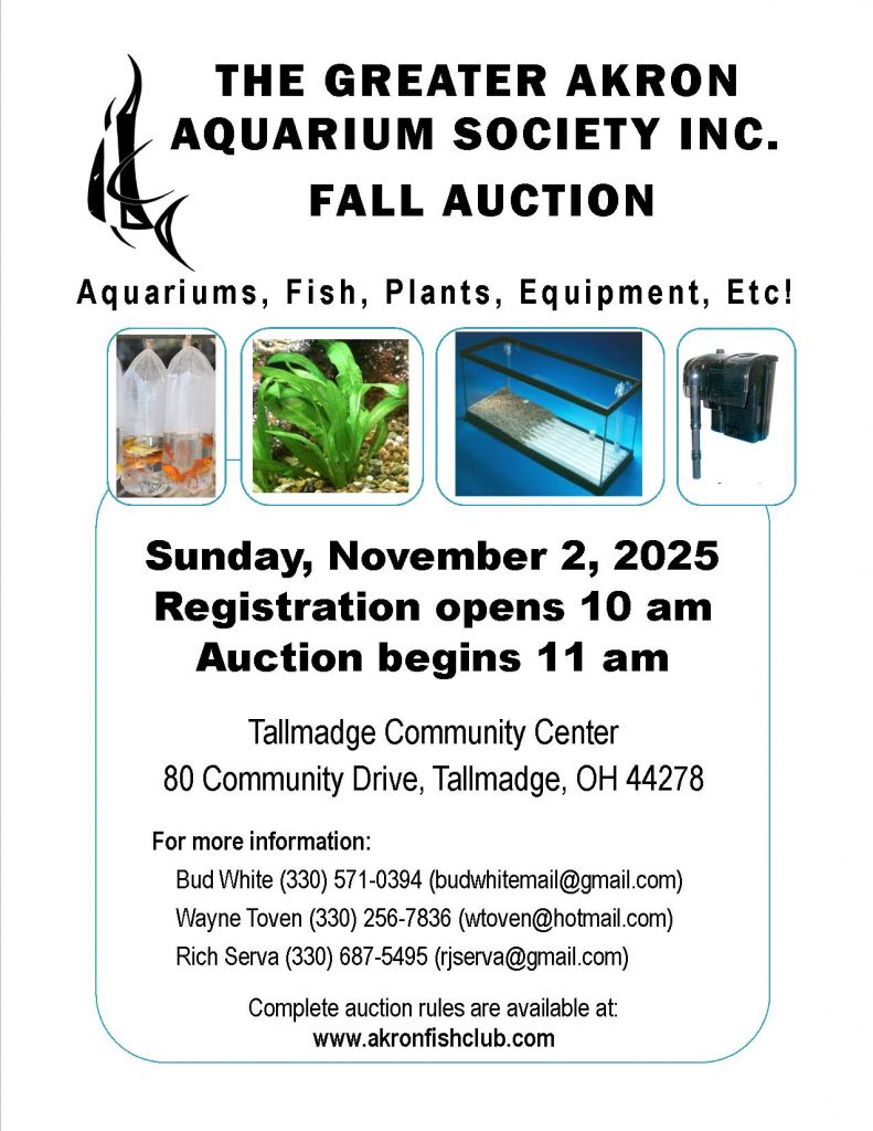 The Greater Akron Aquarium Society Fall Auction will be held on Sunday, November 2, 2025 at the Tallmadge Community Center. Doors open at 10 am for registration, and 11 am is the start of the auction. The event is free admission for the public. There is no cost to register or to enter auction items into the auction. The auction is a 70/30 split for the seller. Note that Sunday, November 2, is also the end of daylight saving time, and clocks are set back 1 hour that morning at 2:00 am. Volunteers who wish to help with setup, please arrive at 8 am. Click here for more details about the fall auction.