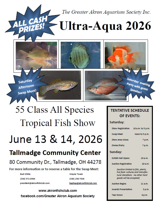 Make plans to participate in Ultra-Aqua 2026, which will be held on the weekend of June 13-14, 2026. The weekend includes a 55 Class All-Species Tropical Fish Show, Saturday Swap Meet, Saturday Speaker and Dinner, and Sunday Fish and Plant Auction. The event is open to the public and free to attend. For dinner on Saturday, all attendees will pay $5.00. See details on the Ultra-Aqua page.